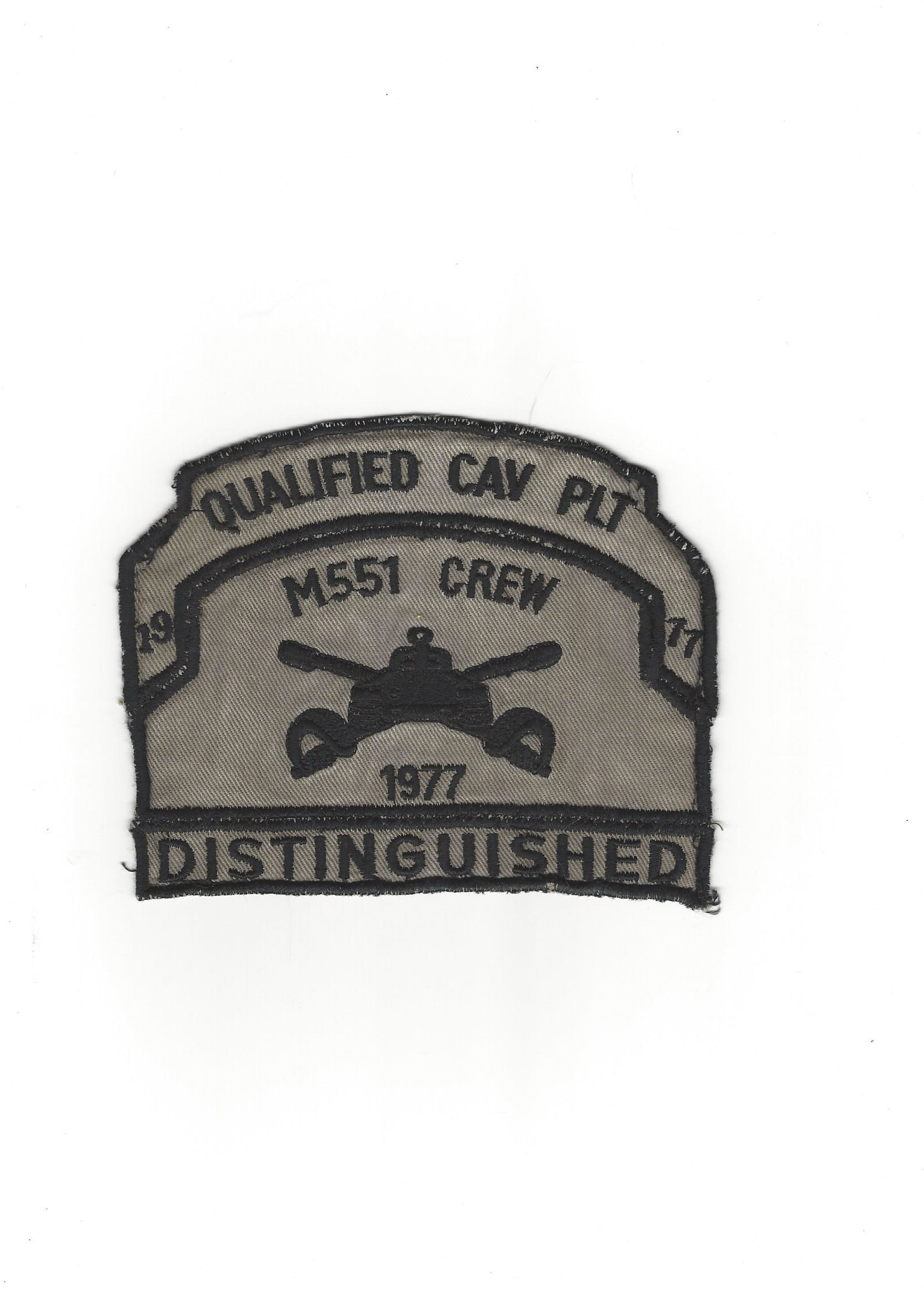 3rd Armored Division 1977 M551 Qualification patch (not in ASMIC catalog) with "Distinguished" tab (ASMIC #3H18) and "1977 Qualified Cav Platoon" scroll (not in ASMIC catalog). German made, embroidered on twill with a standard edge. The tab and platoon scroll were separate from the patch, but the soldier who wore this patch sewed the tab and scroll onto the patch before he attached them to his uniform.