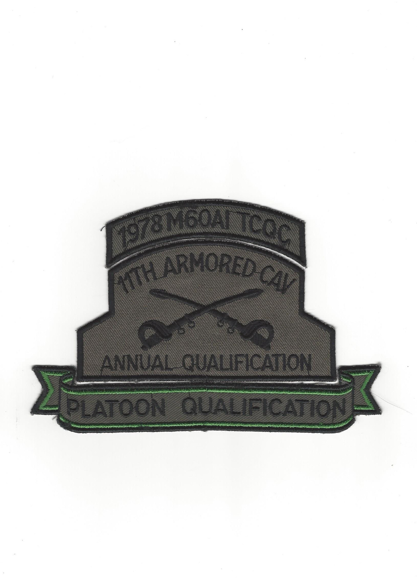 11th Armored Cavalry Regiment Qualification patch (ASMIC #11A) with "1978 M60A1 TCQC" (ASMIC #11D) and "Platoon Qualification" (ASMIC #11B2) tabs. German made, embroidered on twill with a standard edge.
