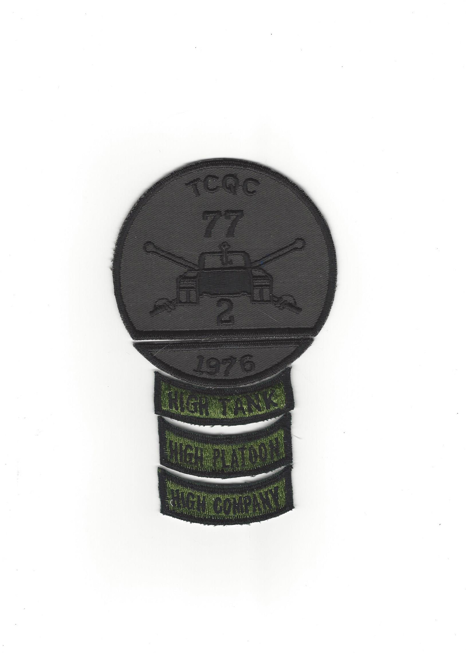 2nd Bn, 77th Armor 1976 TCQC patch with "High Tank," "High Platoon," and "High Company" tabs (9th Inf Div). "1976" is actually on a separate segment; this unit used this same approach in 1977 and 1978. The patch (ASMIC #77G) and "1976" segment are U.S. made, embroidered on twill, and have a standard edge. The tabs are U.S. made, all embroidered, and have a standard edge. Only the patch is in the ASMIC catalog. Although the manufacturing approach and appearance are very different with regard to the patch and year segment, versus the tabs, I received all these items directly from the unit at the same time, so there is little doubt they were worn together.