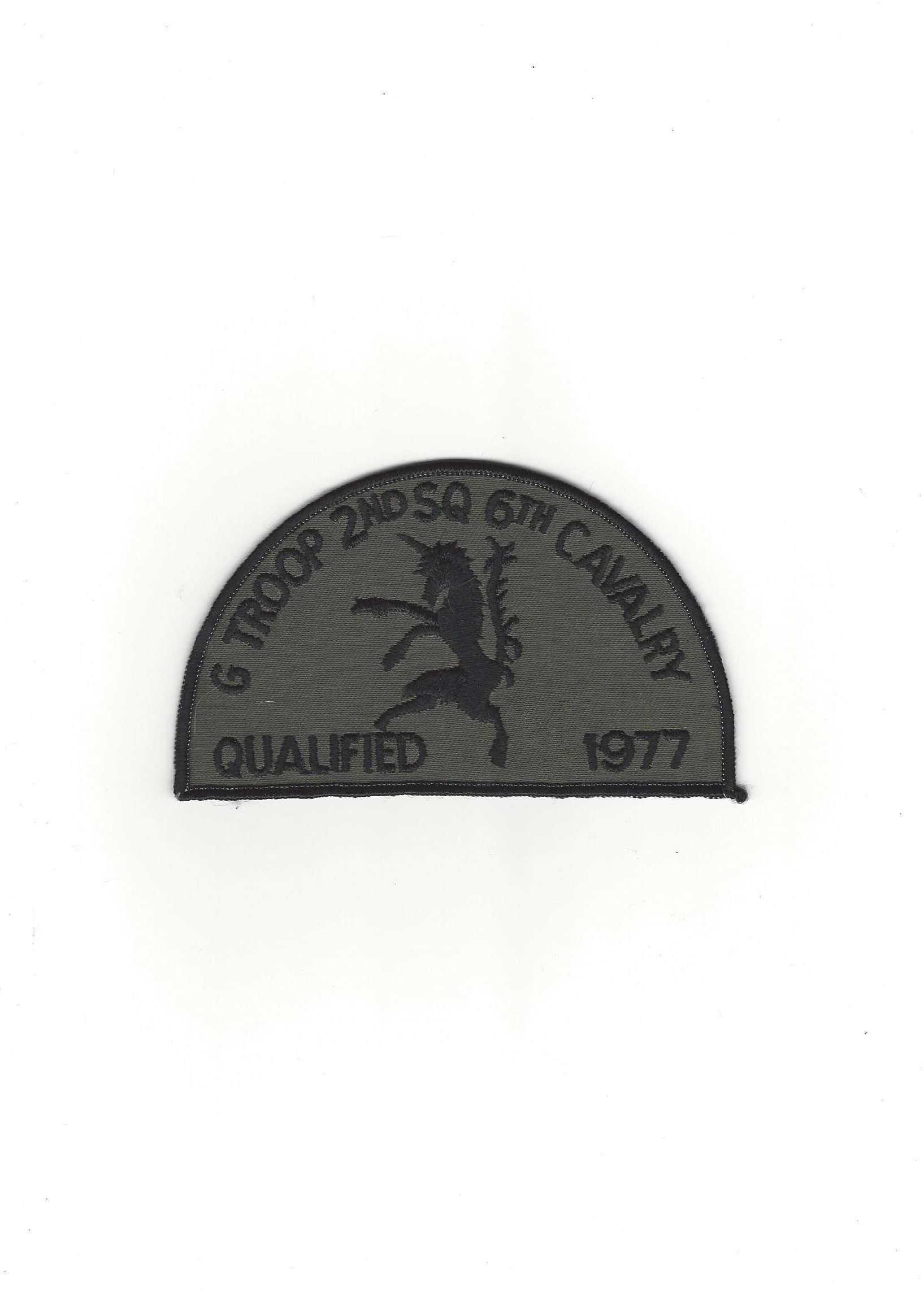 Troop G, 2nd Sqdn, 6th Cavalry 1977 Qualified patch. U.S. made, embroidered on twill with a merrowed edge. ASMIC #6G.