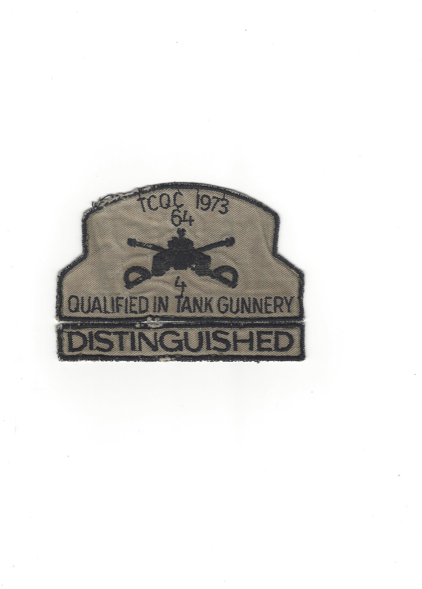 4th Bn, 64th Armor 1974 Qualified TCQC patch with "Distinguished" tab (3rd Inf Div(M)). German made, embroidered on twill with a standard edge. Not in ASMIC catalog, but illustrated in an article in THE TRADING POST. See SFC John Huffman, "Qualification Insignia," THE TRADING POST, (Jan-Mar 1974), p. 69.
