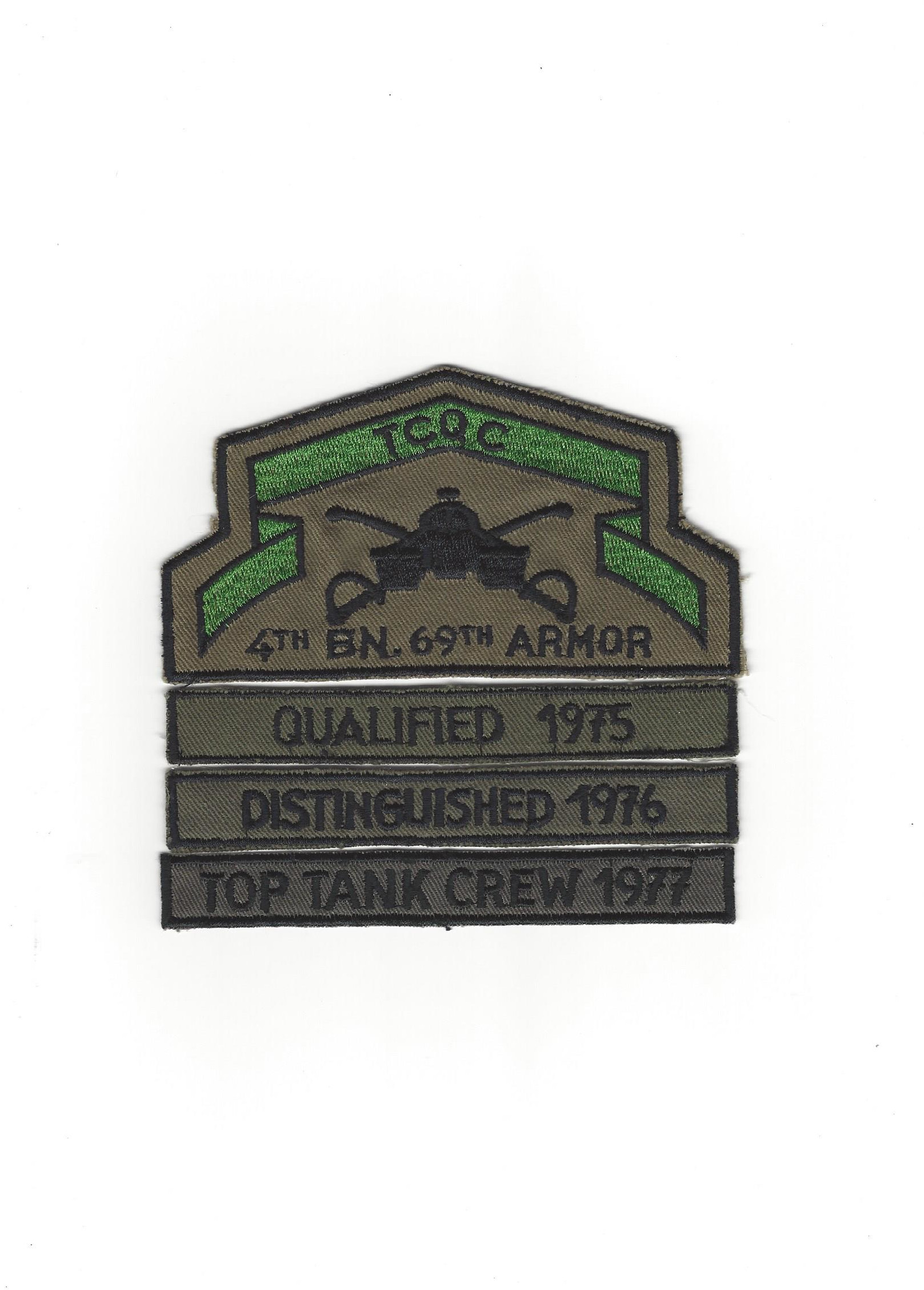 4th Bn, 69th Armor TCQC patch with "Qualified 1975," "Distinguished 1976." and "Top Tank Crew 1977" tabs (8th Inf Div(M). German made, embroidered on twill with a standard edge. Not in ASMIC catalog.