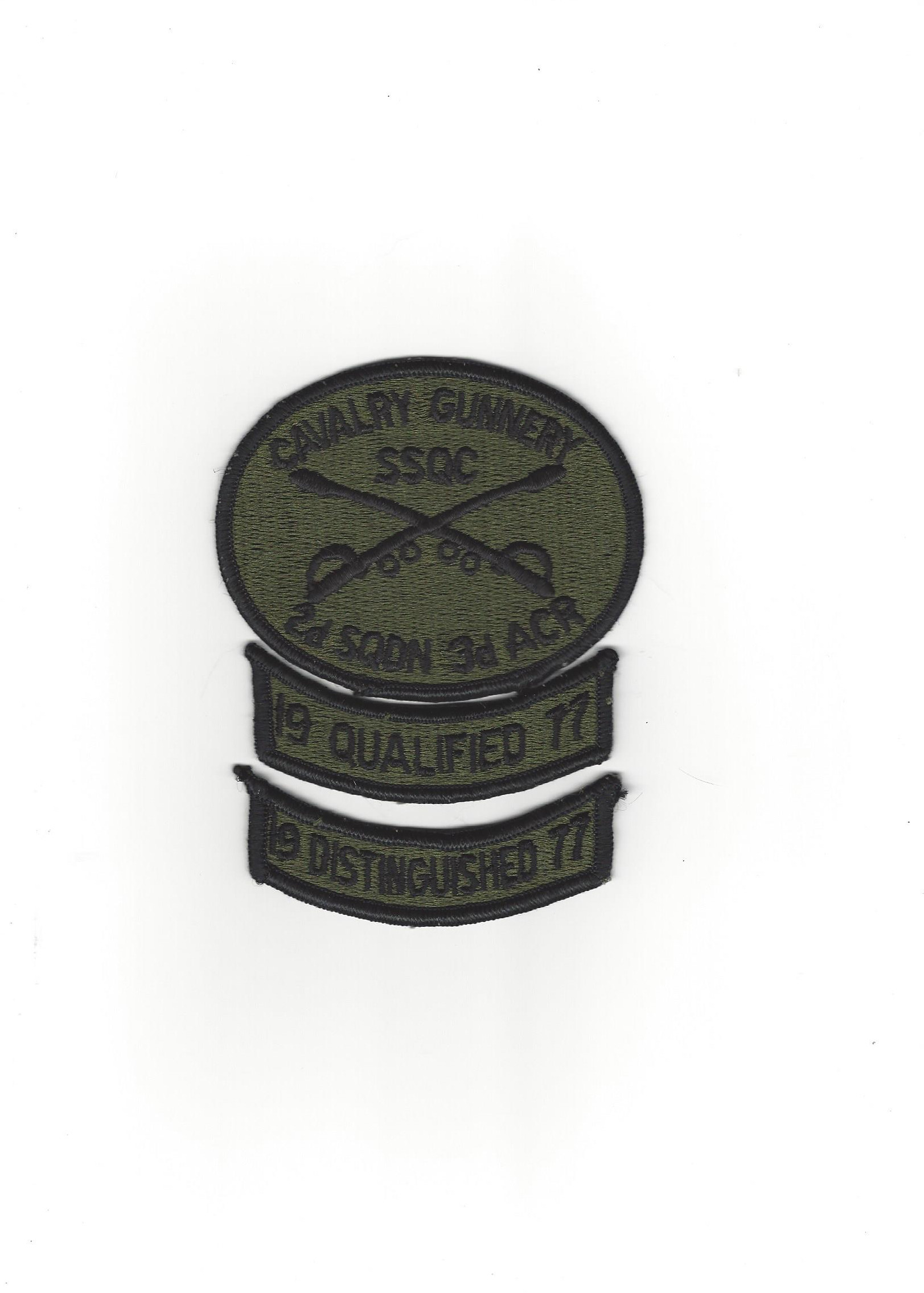 2nd Sqdn, 3rd Armored Cavalry Regiment SSQC (Scout Section [or Squad] Qualification Course) patch with "19 Qualified 77" and "19 Distinguished 77" tabs. U.S. made, all embroidered with a merrowed edge. ASMIC #3D3, 3D4, 3D5. A Scout Squad had two scout vehicles; a Scout Section had two Scout Squads for a total of four vehicles.