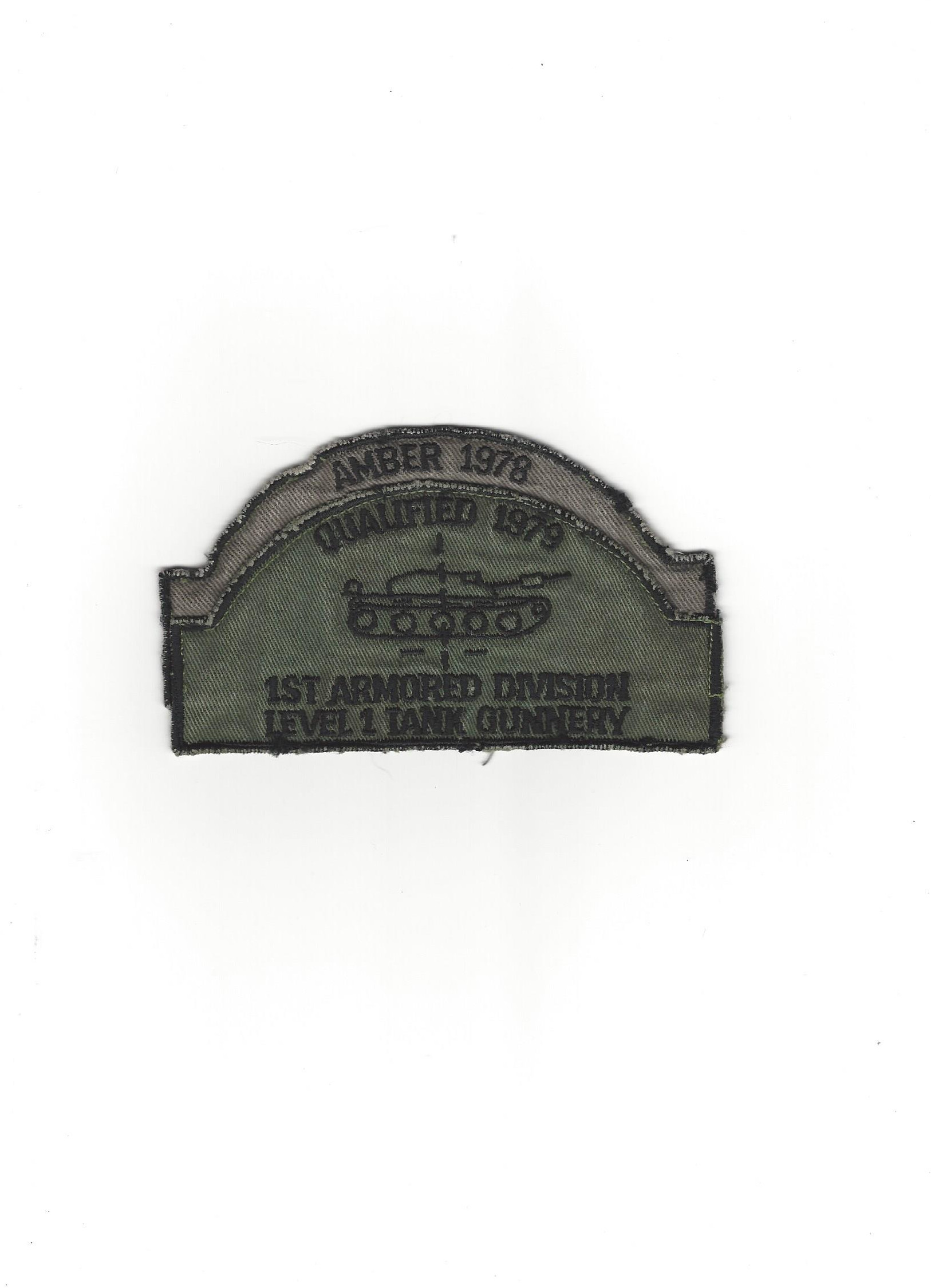 1st Armored Division 1978 "Amber" (qualified) TCQC patch (ASMIC #1L1) with a 1979 Qualified TCQC patch (ASMIC #1L2) sewn on top of the 1978 patch. German made, embroidered on twill with a standard edge.